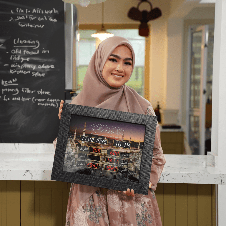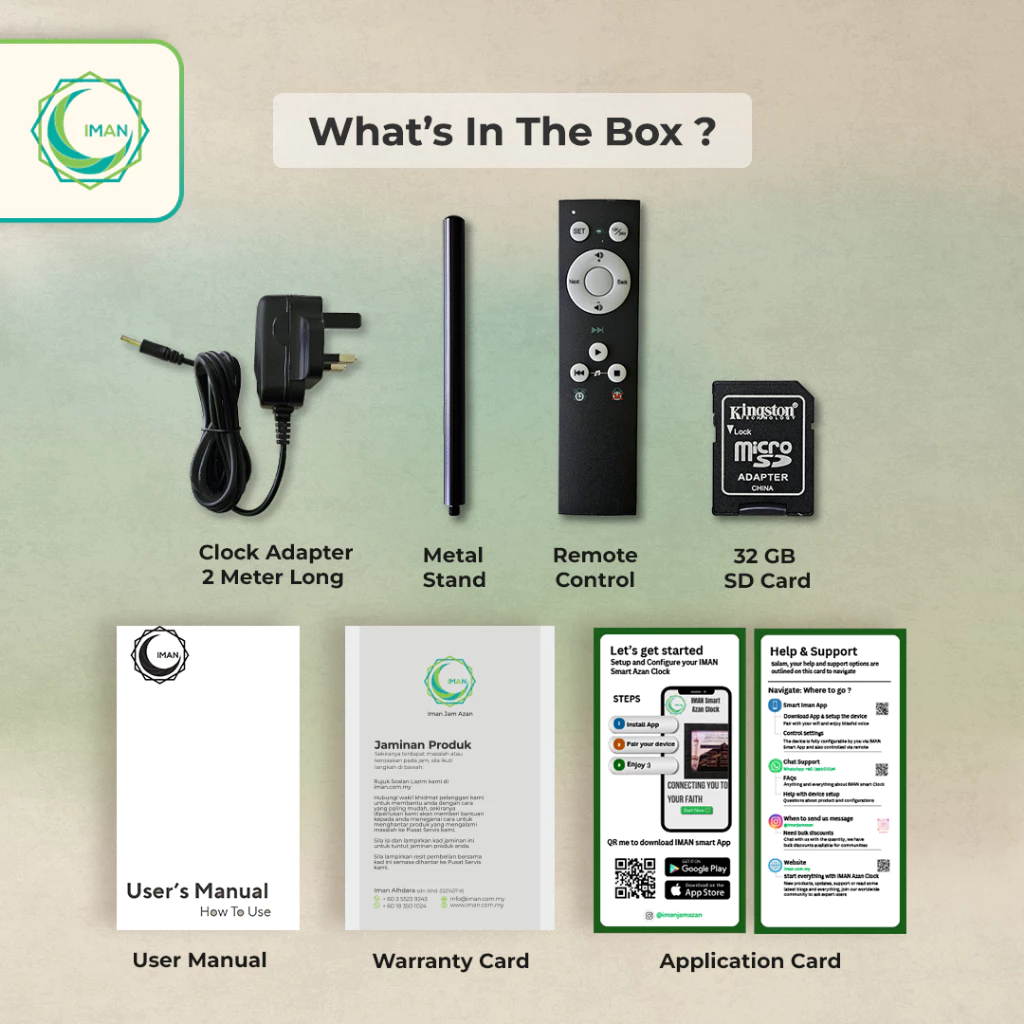 Shop Now “Stay on time for Azan and Solt with IMAN Azan Clock!”Azan, Quran, Hadith, Dua, Zikir and Selawat 1 Year warranty Fast Delivery At Lowest Price Trusted Product Sale! Rated 4.67 out of 5 based on 12 customer ratings From: $190.00 From: $160.00 Model Choose an optionBL-KB-StandardWH-KB-StandardBL-KP-StandardBL-KBST-StandardGD-KP-StandardBL-NW-StandardGD-CG-StandardBR-NW-PremiumBL-KB-PremiumWH-KB-PremiumBL-KK-PremiumGD-CG-PremiumBL-KBS-PremiumWH-CG-PremiumWH-KBS-PremiumBL-KB-StandardWH-KB-StandardBL-KP-StandardBL-KBST-StandardGD-KP-StandardBL-NW-StandardGD-CG-StandardBR-NW-PremiumBL-KB-PremiumWH-KB-PremiumBL-KK-PremiumGD-CG-PremiumBL-KBS-PremiumWH-CG-PremiumWH-KBS-PremiumClear - IMAN Azan Clock quantity + Add to cart Additional information Additional information Weight 2 kg Dimensions 12 × 8 × 4 cm Model BL-KB-Standard, WH-KB-Standard, BL-KP-Standard, BL-KBST-Standard, GD-KP-Standard, BL-NW-Standard, GD-CG-Standard, BR-NW-Premium, BL-KB-Premium, WH-KB-Premium, BL-KK-Premium, GD-CG-Premium, BL-KBS-Premium, WH-CG-Premium, WH-KBS-Premium, BL-KBS-Premium WHAT’S IN THE BOX:Iman Smart ClockSD card 32GB Adaptor Remote ControlMetal StandManual Number one Azan clock selling in Australia The first home Azan clock with WIFI system IMAN Smart applicationLearn and Listen to quraan recitation, edit daily alarms to fit your daily schedule and many other features Features of the Azan Clock Design and lookElegant design and attractive look that complete your house decoration. ‘Learning Quran’ Function Play and repeat Quran verses, as much as you want until you memorise it High quality materialsHigh-quality materials: protective plastic from the back with a metal stand. ‘Recite Quran’ Function Listen to any Surah with your favourite reciter (Afasy, Shiraim..) Tempered GlassTempered glass with high quality painting, wooden frame. Full control through the app Add/delete/ edit alarms Increase/ decrease sound volume and digits brightness Auto set for time and date Adjust Hijri date Message us to Learn more about Iman clock Whatsapp Experience IMAN Azan Clock Schedule for 30 minutes after Azan PraytimeType of RecitePeriodSubuh Surah Ya’asin18 MinutesSyuruDoa Dhuha3 MinutesZuhur Surah As-Sajdah9 MinutesAsar Surah Al-Waqiah11 MinutesMaghribSurah Ar-Rahman12 MinutesIsya’Surah Al-Mulk7 Minutes The Quran is recited after 10 minutes of the call to prayer along with the translation (ALL 30 JUZ OF THE QURAN).Daily dhikr reminders every 15 minutes.10 types of call to prayer as options.200 types of alarms that can be set.30 types of dhikr that can be selected.The SD Card program can be easily accessed using a computer – if you need to make your own changes. Daily schedule of Quranic recitations/duas/prayers Time ReciteType of RecitePeriod5.05 amQursi2 Minutes7.05 amMorning Zikir 21 Minutes7.50 am (Friday)Surah Al Kahf40 Minutes8.35 amRuqyah1 Hour 14 Minutes12.05 pmBismillahillazi2 Minutes3.05 pmAamanar Rasul2 Minutes6.05 pmEvening Zikir 21 Minutes9.35 pmQursi2 Minutes10.35 pmSurah Al Kahf – First 10 3 Minutes Work with IMAN Message us if you’re interested in selling our Iman Azan clock WhatsApp
